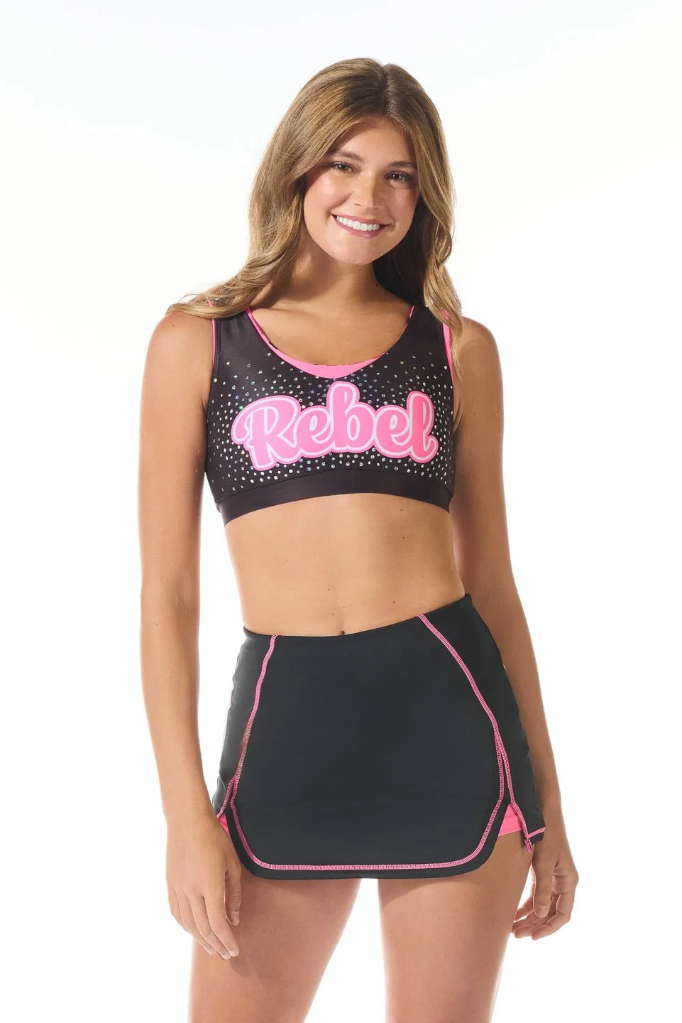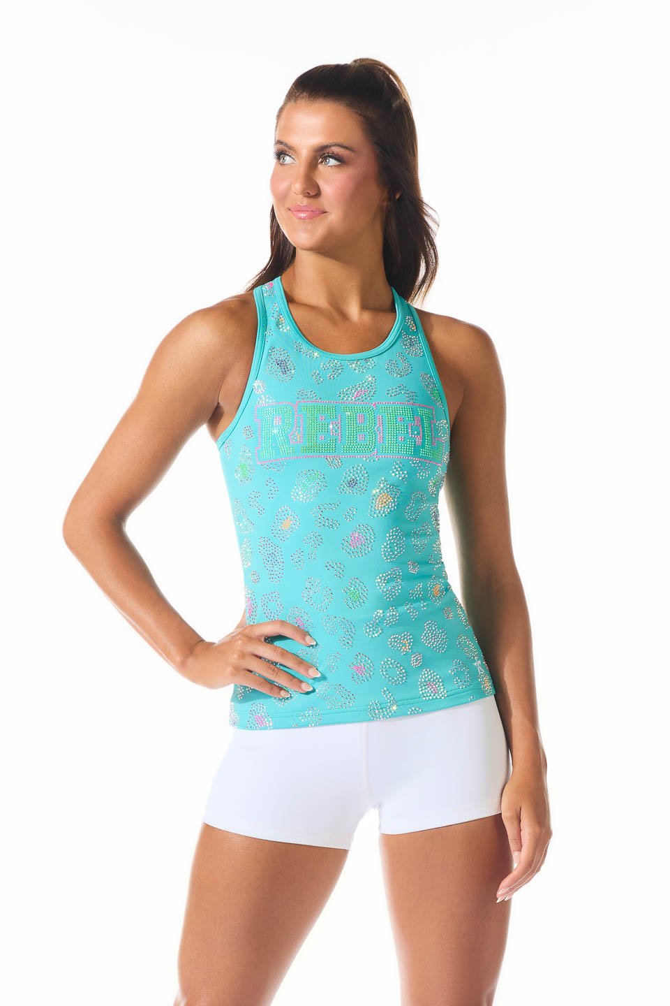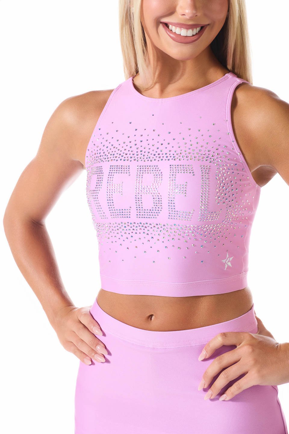 Say hello to Rebel's all-new JewelLuxe crystal designs. By using high-tech robotics, we can create intricate logo designs beyond human capabilities that result in a shine like never before! Add a JewelLuxe logo to any Rebel product, from uniforms, to tanks, to sports bras, warm ups and more, for as low as $40!